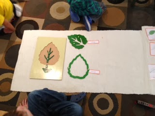 This week I have been studying leaves with a few of the children in the class. We have spent a great deal of time at the playground hunting leaves and bringing our favorites back to the classroom. We have some resources in the classroom that help us learn about leaves such as books, nomenclature cards and our “Parts of the Leaf” puzzle. We have been examining the individual parts of our real leaves and learning the names from our nomenclature cards. This has been a nice lesson in nature and a great vocabulary builder. ~Ms. Melanie